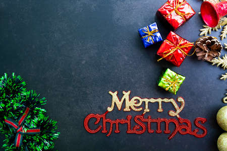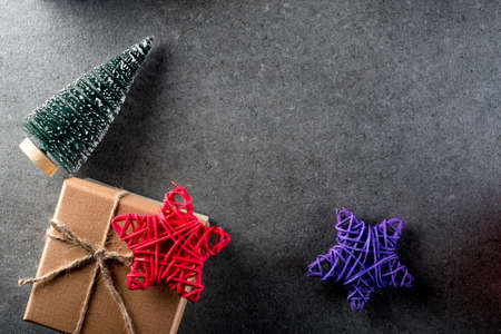 Christmas background with decorations and gift box on dark board. Eve, new year, x-mas holidays concept