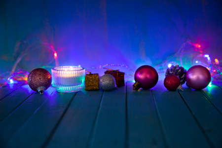 Christmas and New Year composition on a blurry blue background with place for text. Close up.