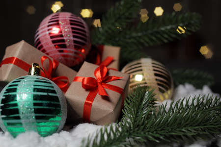 Christmas gifts next to Christmas balls, against the background of flashing lights of a garland in out-of-focus and fir branches