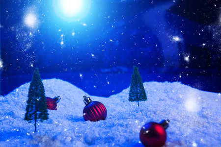 Christmas background with Christmas balls on snow over fir-tree, night sky and moon. Shallow depth of field. Christmas background. Fairy tale. Macro. Artificial magic dreamy world