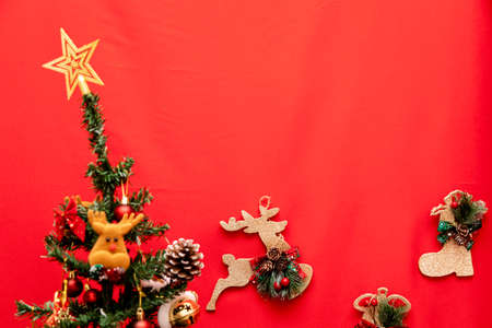 Christmas background with xmas tree on red canvas background. Merry christmas card. Winter holiday theme. Happy New Year. Space for text. christmas backdrop top view. Flat lay.