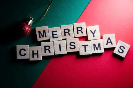 Inscription Merry Christmas outlined on red and green background with copy space. Selective focus on Lettering Merry Christmas next to Christmas ball. Celebration concept.