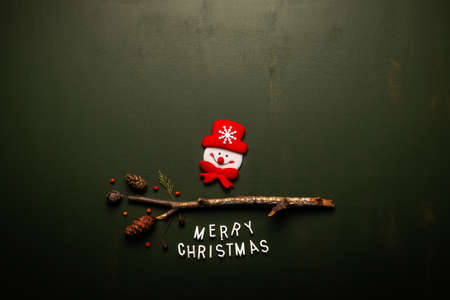 Merry Christmas text flat lay top view with Snowman on green background, xmas holiday conceptual image