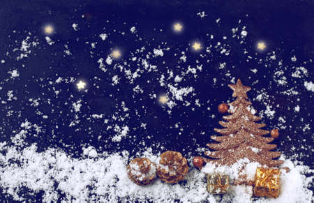 christmas, new year postcard, golden spruce, gifts, cones, night background, snow and stars, top view