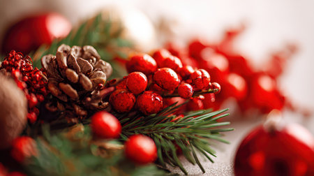 A charming arrangement of holiday decorations featuring red and gold ornaments, pinecones, and vibrant berries, perfect for festive celebrations.