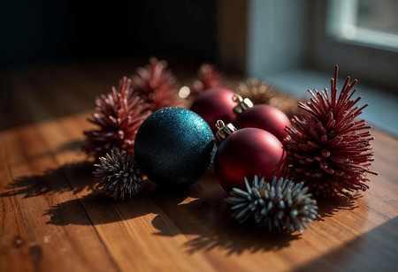A collection of festive ornaments and pinecones lay on a wooden surface. Rich reds and a touch of blue create a vibrant display, illuminated by gentle sunlight streaming through a nearby window.