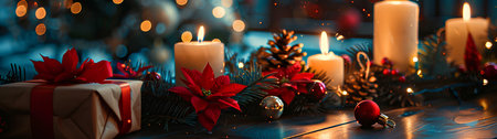 Christmas background with burning candles, gift boxes and poinsettia