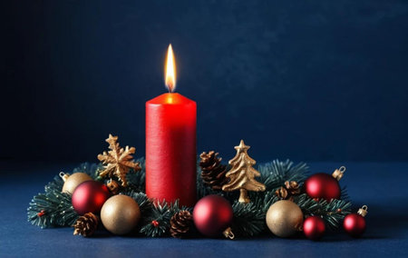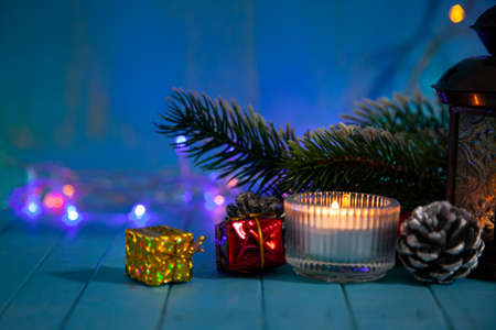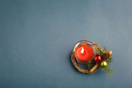 Christmas decoration with burning candle and fir branches on dark blue background.