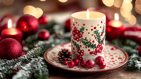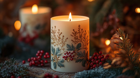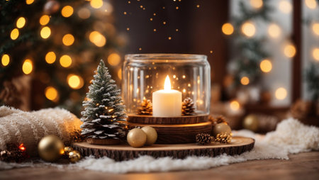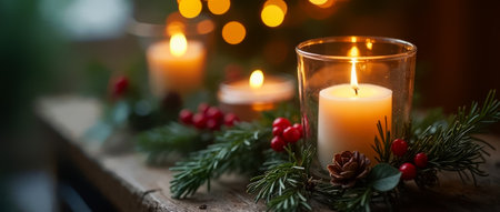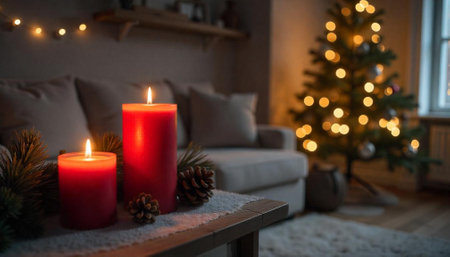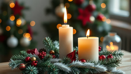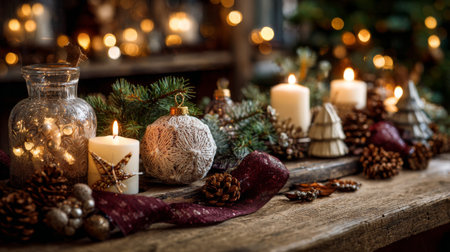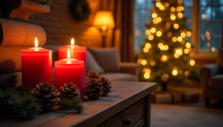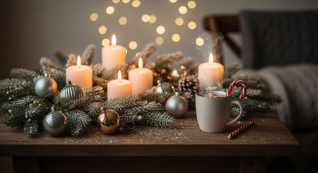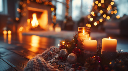 Cozy Christmas decorations with candles and lights, creating a warm and festive holiday atmosphere