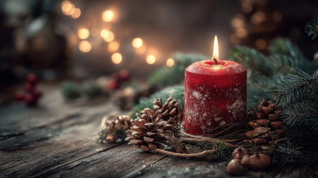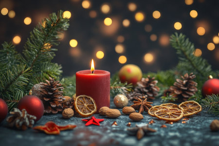 Christmas background with a red candle, Christmas decorations, and bokeh lights. Christmas candles and festive elements on a table in warm colors. Christmas card, a lit red candle, a Christmas tree branch, decorated nuts, dried fruit slices, and red star ornaments. --ar 3:2 --v 6.1 Job ID: 628d3ccb-14a6-4bbd-8a1e-7a448a3b6afb