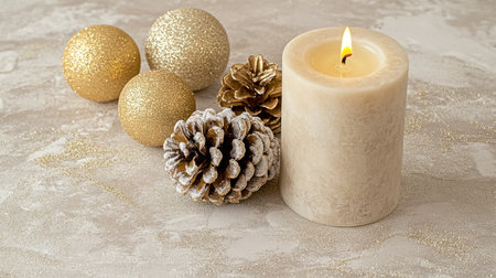 A soft beige background with a single pine cone and an old-fashioned candle, surrounded by glittering gold decorations, creates a festive atmosphere for a Christmas or New Year banner design. The focus is on the candles and cones, set against a light gray backdrop that enhances their glow. There is ample space at the top to add text or graphics. High resolution, detailed textures, bokeh effect, and a close-up shot. --chaos 30 --ar 16:9 --v 6.1 Job ID: ba6a9353-c0ef-4354-b71f-871963534a83