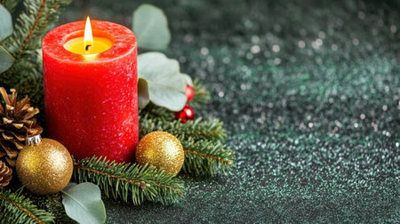 A red candle with eucalyptus leaves and Christmas decorations on a green bokeh background banner, with copy space for text. The focus is soft on the left side of an illuminated Christmas decoration with greenery. The lighting is soft and diffused, creating a dreamy atmosphere. This design would be suitable as a digital backdrop or wallpaper. --chaos 30 --ar 16:9 --v 6.1 Job ID: cbd15bb5-dc80-4218-8d3e-77b61f0cf155