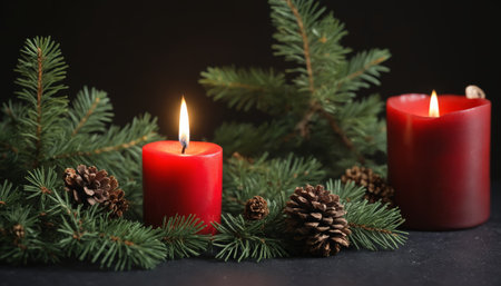 Two glowing red candles stand amidst lush pine branches and scattered pine cones, creating a serene and inviting ambiance perfect for winter festivities.