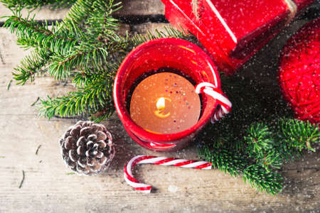 Red and White Christmas. Burning Candles, Coniferous Branches and Christmas Balls in the snow
