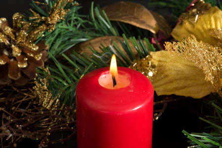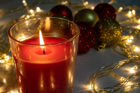 Red christmas candle, burning candle fire on a table with holiday garland and pine tree decorations and balls