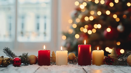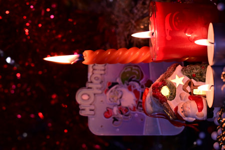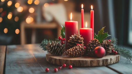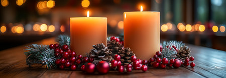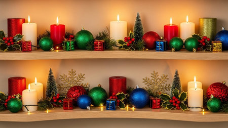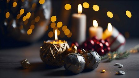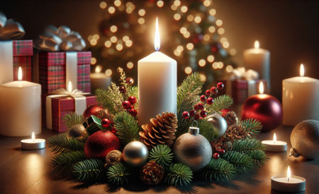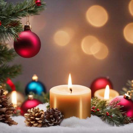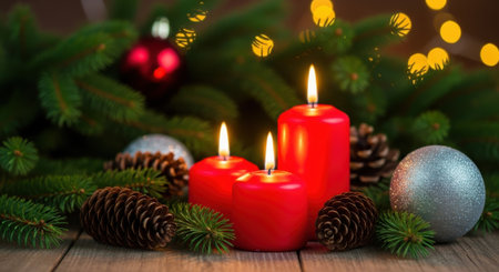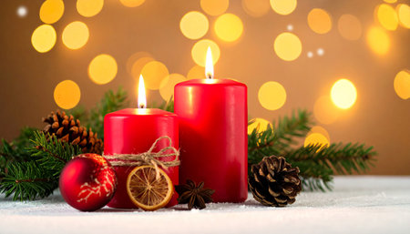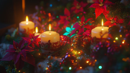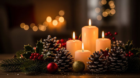 Christmas candles burning brightly, surrounded by festive decorations, create a warm and inviting atmosphere