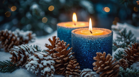 Two lit red Christmas candles sit on snow with pine cones and ornaments, bokeh lights in background
