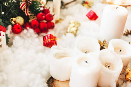 White candles, snow, gifts and red berries. Christmas background.