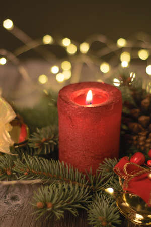 Candle and Christmas decorations on the background of Christmas lights. Festive postcard.