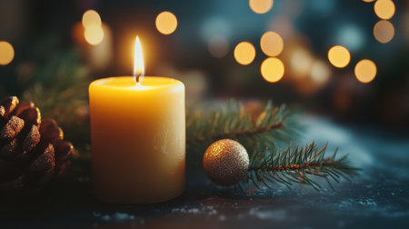 A single lit candle sits on a decorative surface, surrounded by pinecones and Christmas ornaments, with a blurred background of warm bokeh lights.