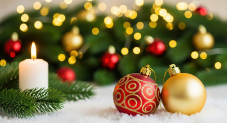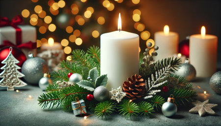 A lit white candle and green fir branches are placed next to red and gold Christmas ornaments, with a blurred background of warm, glowing lights creating a festive bokeh effect.