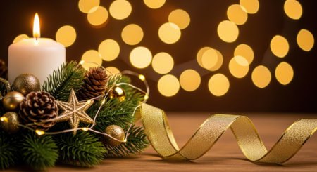 A warm and inviting still life of a lit white candle nestled in a Christmas wreath with pinecones, a star, and a golden ribbon, set against a backdrop of sparkling bokeh lights.