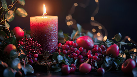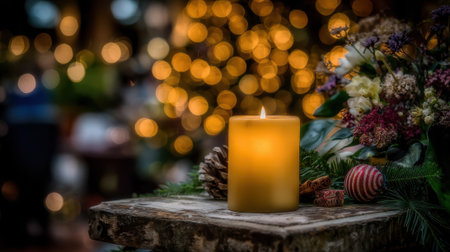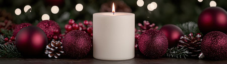 A glowing candle surrounded by festive decorations and twinkling lights, symbolizing warmth and celebration as the year draws to a close