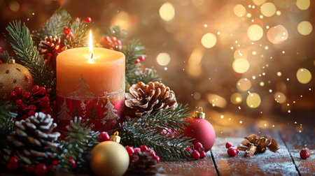 A lit Christmas candle surrounded by pinecones, red and gold ornaments, and green pine branches, creating a cozy holiday atmosphere with soft glowing lights.