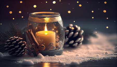 Burning candle and Christmas decoration over snow and wooden background with festive mood with Generative AI Technology