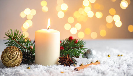 A lit cream candle is placed on snow with a gold bauble, pine cones, fir branches, and star anise, against a bokeh...