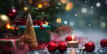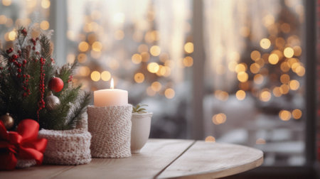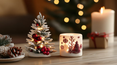 A cozy table adorned with a small Christmas tree and a flickering candle, radiating warmth and festive spirit, inviting joy and celebration.