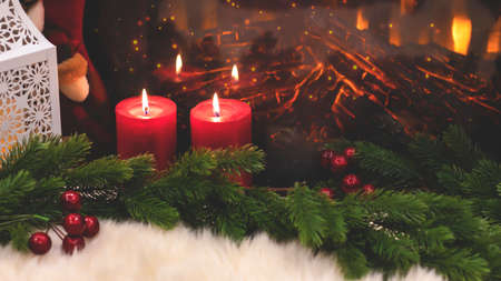 New Year's festive background with Christmas balls, Christmas garland, fireplace and red candles.