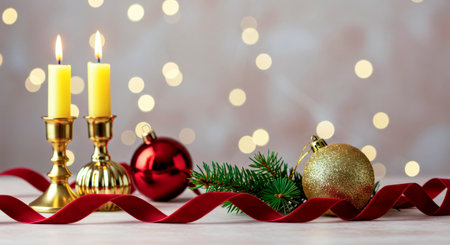 Holiday candles and ornaments on a table with a red ribbon and sparkling lights. Christmas atmosphere.