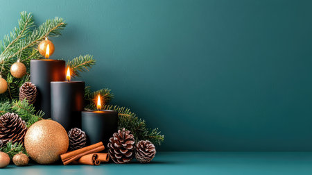 Seasonal tabletop with black candles, brown pinecones, and cinnamon sticks against a luxurious dark teal backdrop