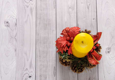 A yellow candle and a New Year pine wreath on an old wooden background.