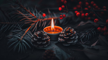 A warm candle flame surrounded by pine cones and red berries creates a cozy, festive atmosphere.
