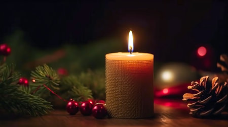 Christmas candle with fir branch and pine cones on dark background, AI