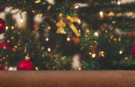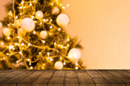 Chistmas background and empty wooden table with blurry background or wooden desk with holiday bokeh background.