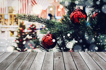 wooden terrace or desk with copy space for display of product or object presentation with decoration ball hanging on christmas tree with snow effect background, happy new year and christmas concept
