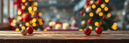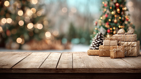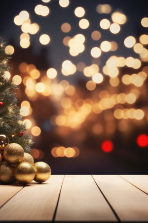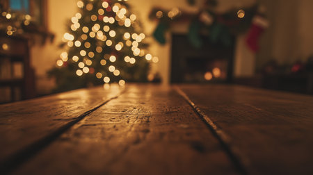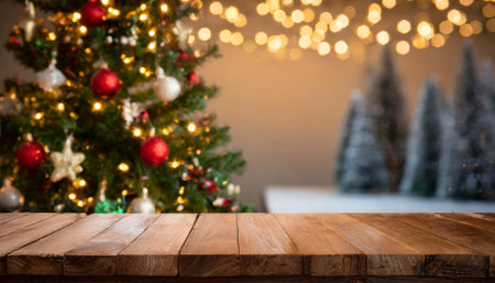 An inviting empty wooden table with a festive Christmas backdrop showcasing warm lights, holiday ornaments, and seasonal charm. Ideal for product displays, creative designs, or celebration