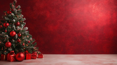 Christmas tree background with festive red and gold balls, ornaments, and ribbons for a merry holiday greeting card