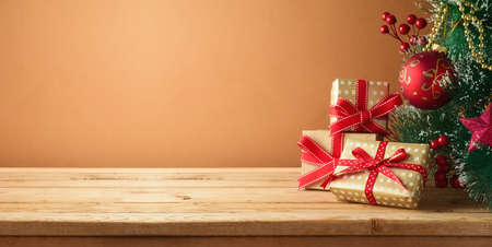 Christmas tree and gift boxes on wooden table. Background for product montage display