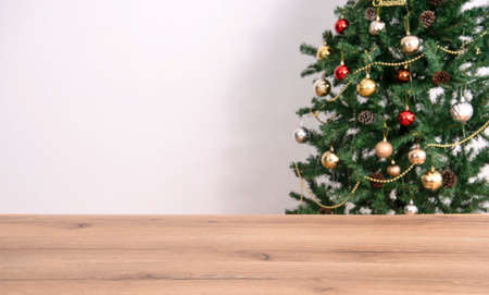 A table with a place for your advertisement. Christmas tree with lights. Home interior.