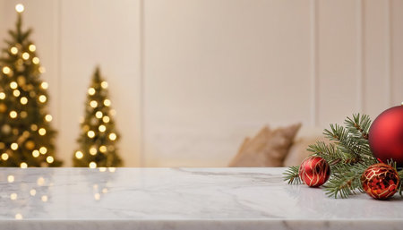 A marble surface in the foreground several red Christmas ornaments and green pine branches. In the blurred background, two Christmas trees are visible, illuminated by warm yellow lights. The overall mood is festive and cozy.