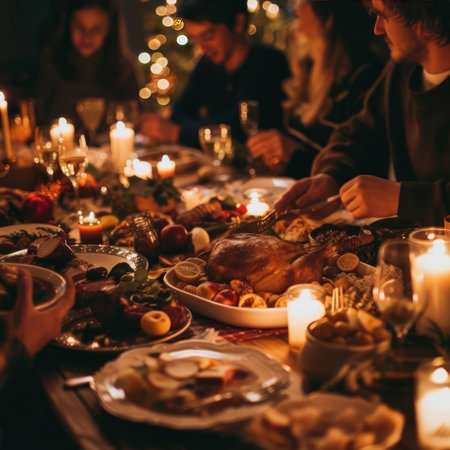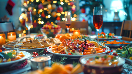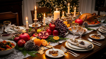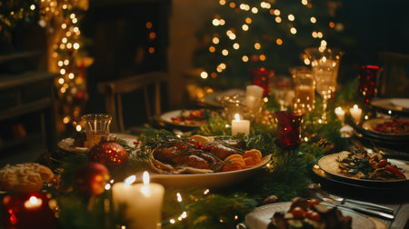 Table decorated with Christmas feast, illuminated by warm candlelight. Tree lights add festive touch to holiday celebration