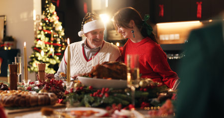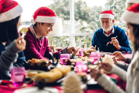 Large family gathering concept man woman small little girl in santa claus hat deer headband sit table with x-mas feast eat speak talk with mature retired relatives in house merry newyear decoration