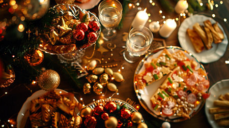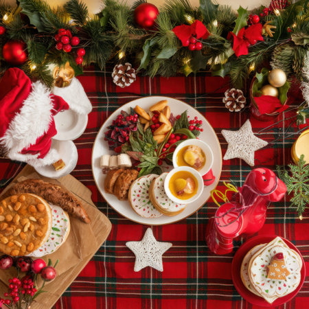Flat lay of a festive holiday table setting with various Christmas foods, decorations, and seasonal tableware, creating a cheerful atmosphere.