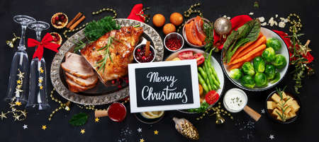 Traditional Christmas dinner on dark background. holiday food. top view, panorama