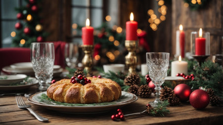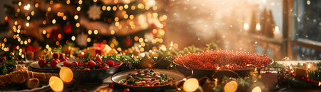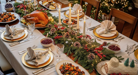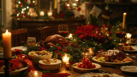 Enjoy a warm Christmas ambiance with a well-decorated table filled with festive dishes, candles, and vibrant garlands.