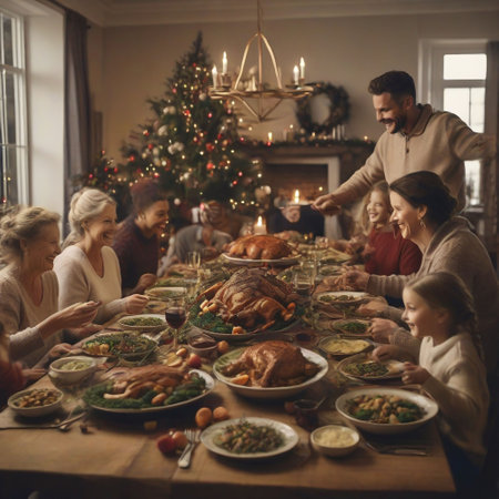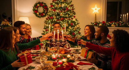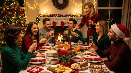 A group of people are gathered around a table laden with food, celebrating and toasting. The scene is illuminated by warm lighting, including a fireplace and string lights. It depicts a festive atmosphere suitable for illustrating holiday celebrations, social gatherings, or concepts of togetherness and sharing.
